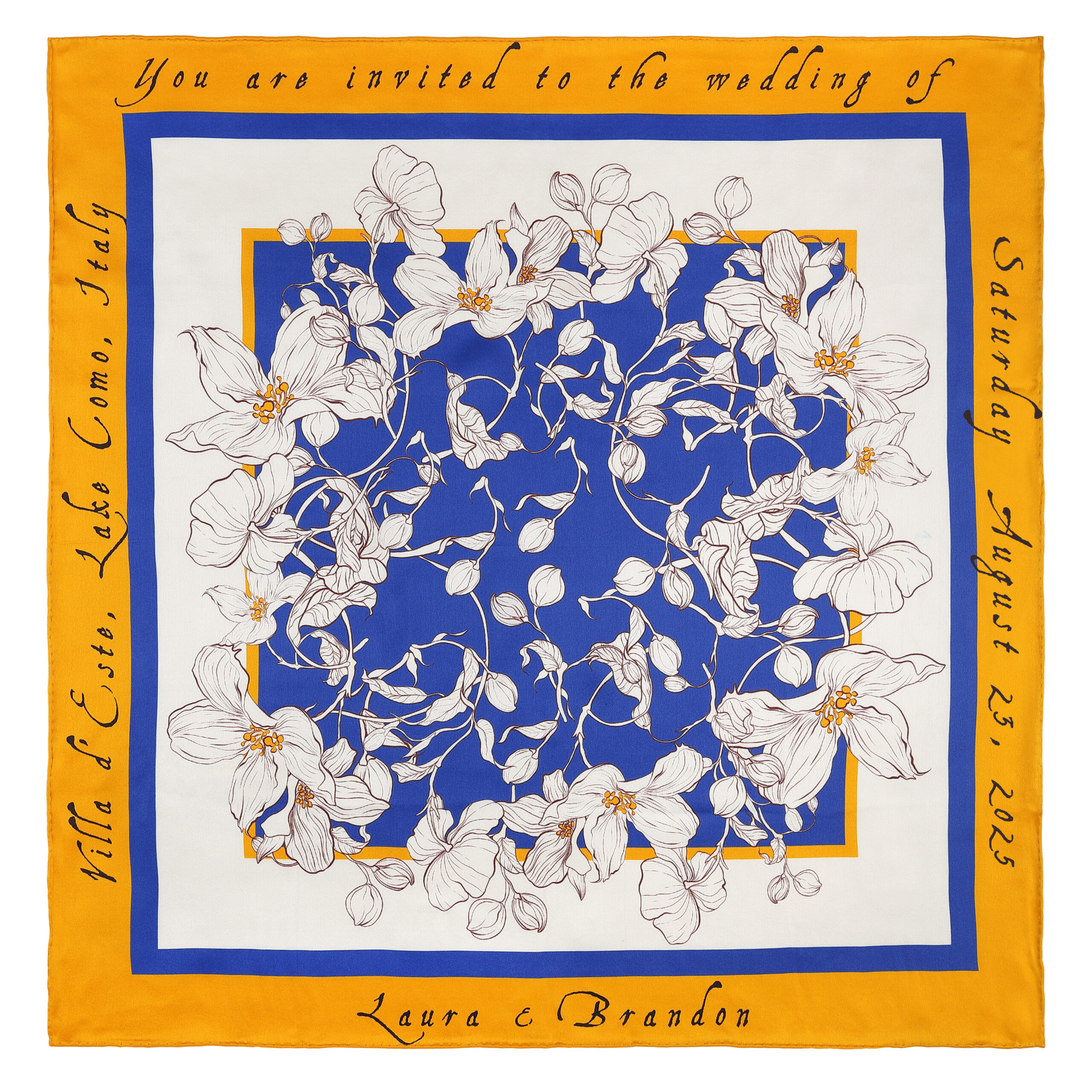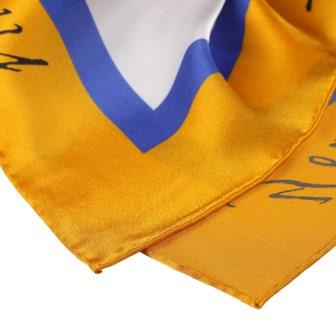‘Apple Blossom’ captures the fleeting beauty of spring in a delicate, artful design. Framed by a radiant, gold-like border and a deep blue square, fine lines depict apple blossoms, reaching into the wider white margin in a lovely dance of nature and artistry. The model wears a 70x70cm (approx. 27.5×27.5 in) Silk Satin scarf, adding an elegant layer to your personalized ensemble.