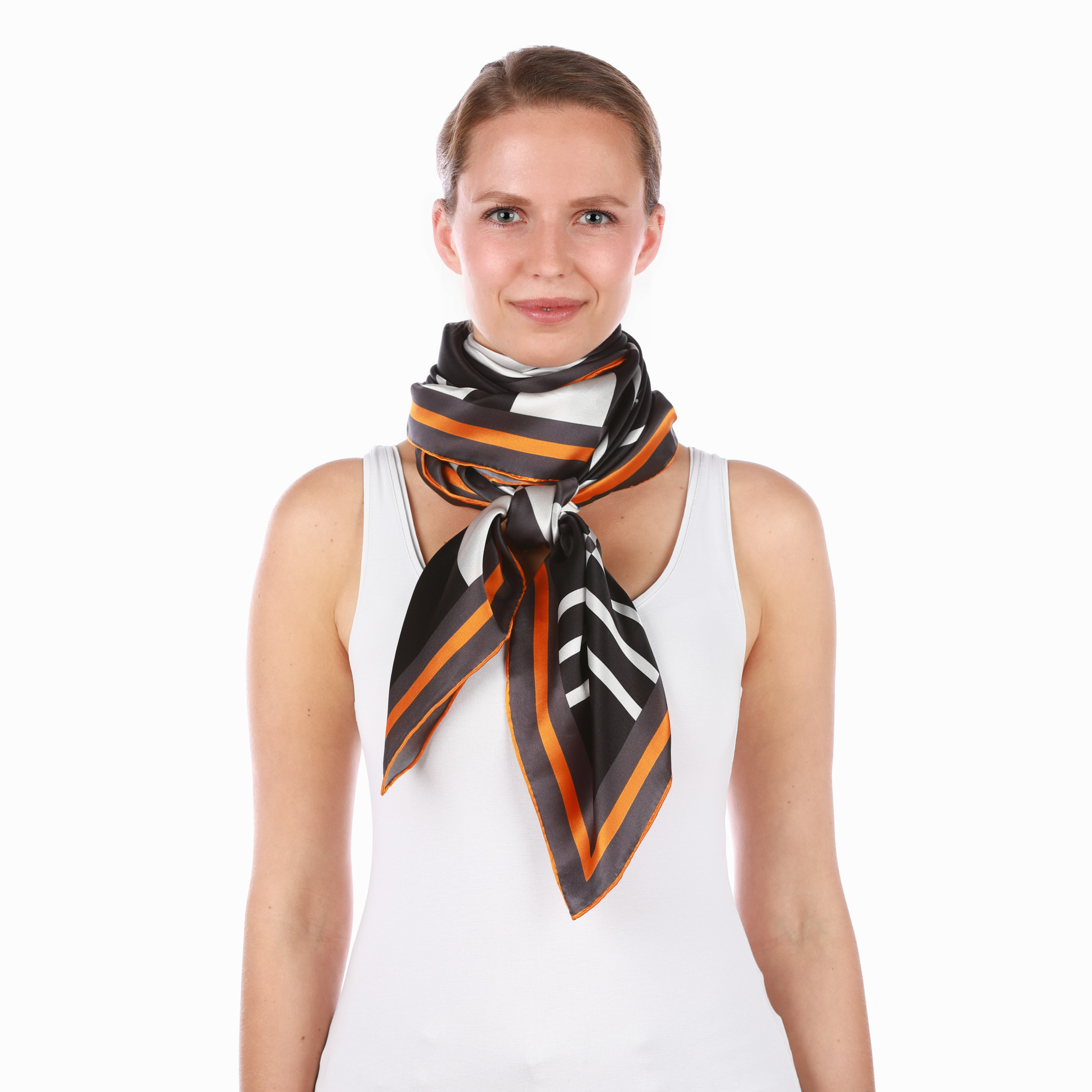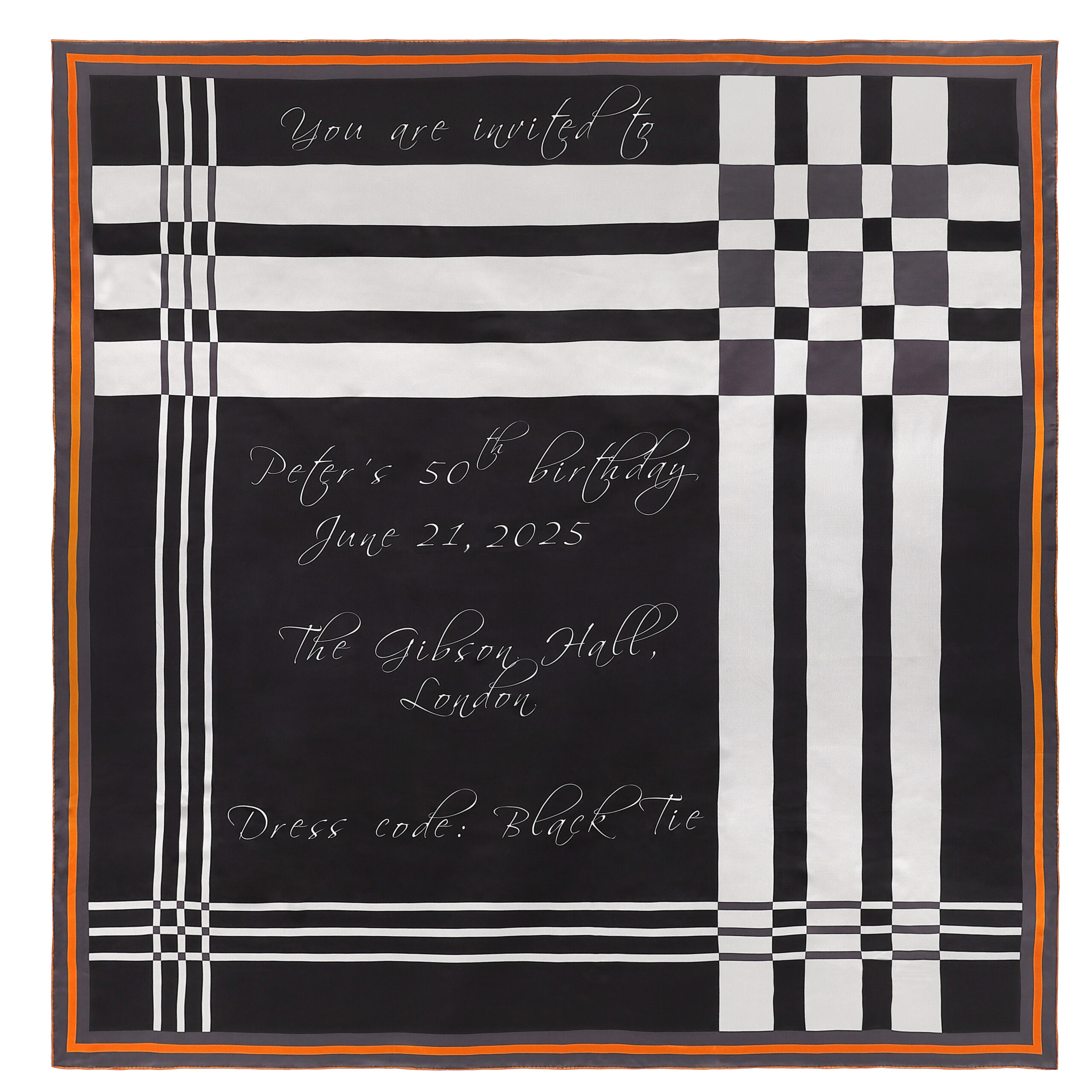 Elegance meets modernity in ‘Black Tie’, a signature in-house creation. Dominant black and white are offset with accents of vibrant orange, composing a dynamic and refined design. Four groups of three stripes create a frame for your personalized text, intersecting in greyish hues and generating a captivating corner pattern. Displayed on a 140x140cm (approx. 55×55 in) Silk Satin scarf, this design underscores the bold sophistication and innovative spirit of By Biehle.