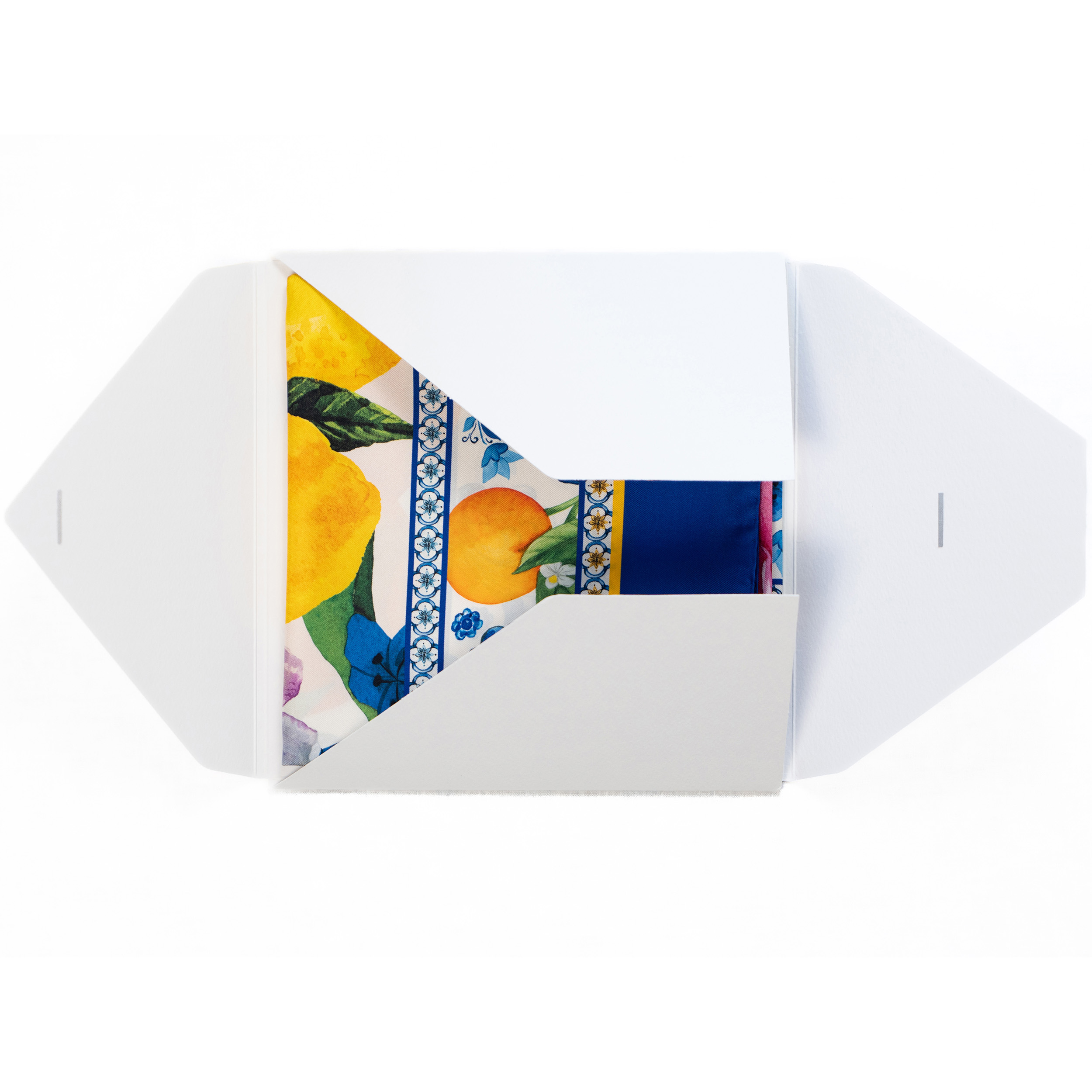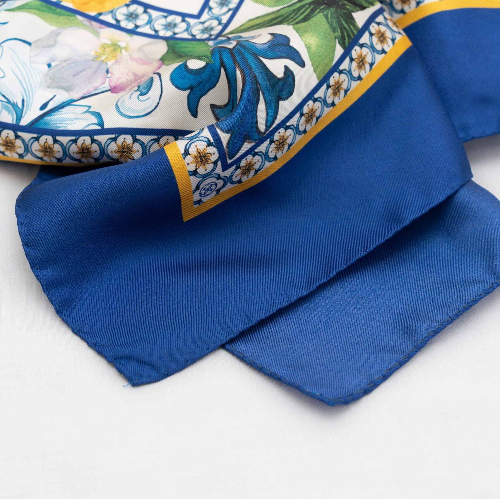 ‘Fiorella’, a hand-painted design by Ceci Johnson, is a picturesque tribute to the Amalfi coast. The deep blue outer border, embellished with your custom text, frames intricate layers of tile-like patterns and a lush display of blooms, oranges, and lemons. Central to the design are two large, attention-grabbing flowers. This scarf radiates the joy and vibrancy of Italian summers.
