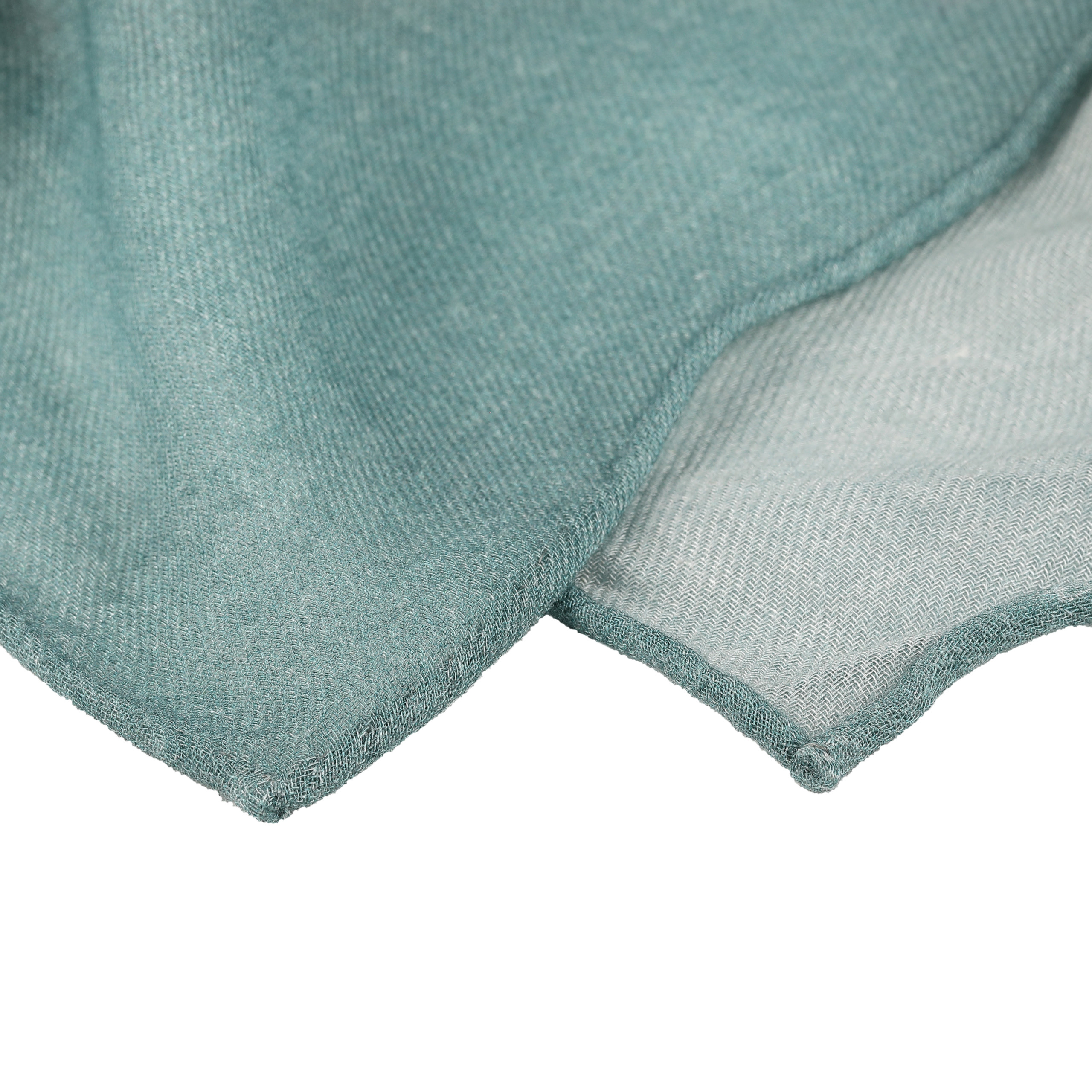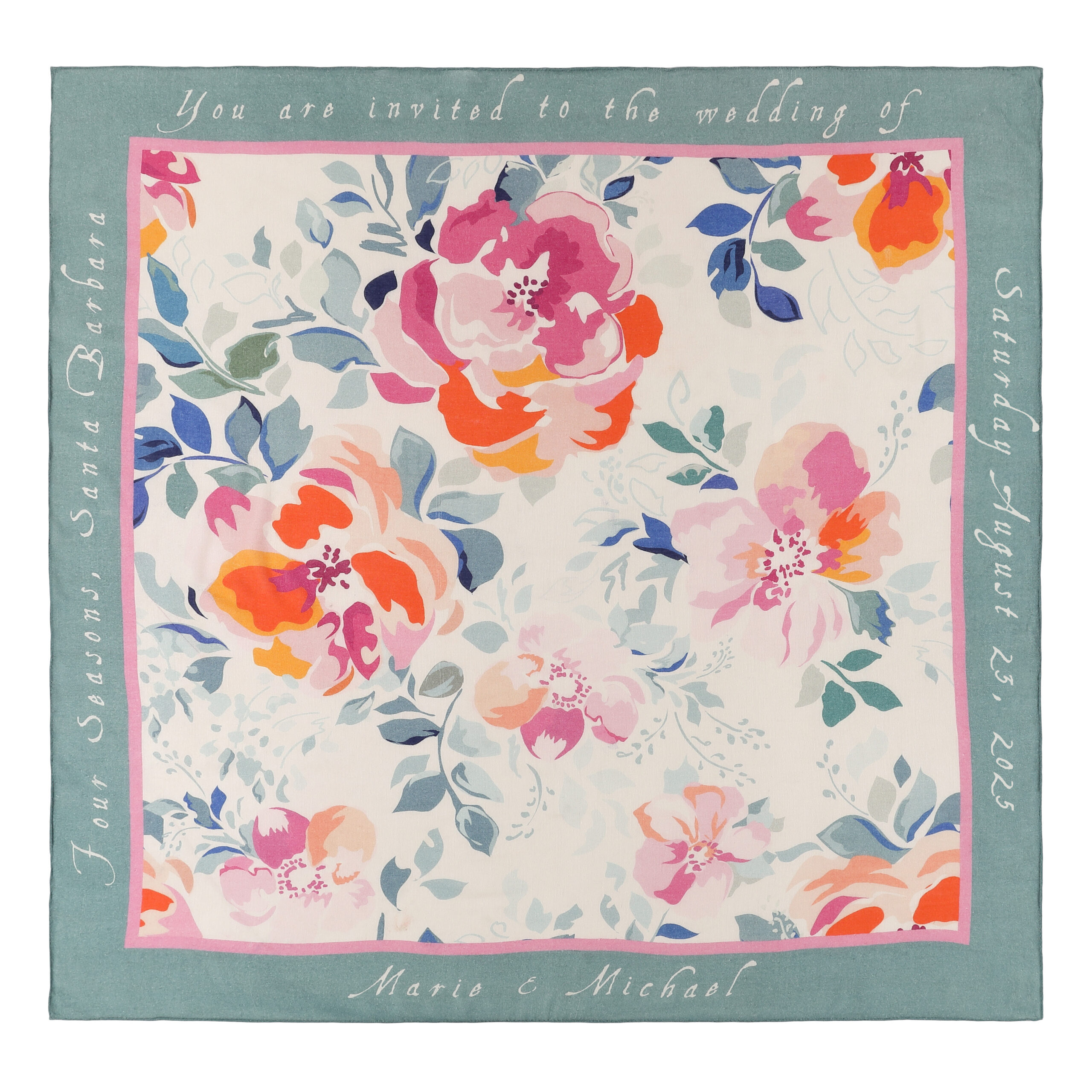 The ‘Flowers Green’ design features a tranquil floral motif. A calm green border, highlighted by a slim pink frame, surrounds blooming roses in different shades of pink and orange. This captivating floral presentation offers an air of tranquillity. The model displays a 140x140cm (approx. 55×55 in) Silk Cashmere scarf. For a different color palette with the same design, take a look at our ‘Flowers Rose’ scarf.