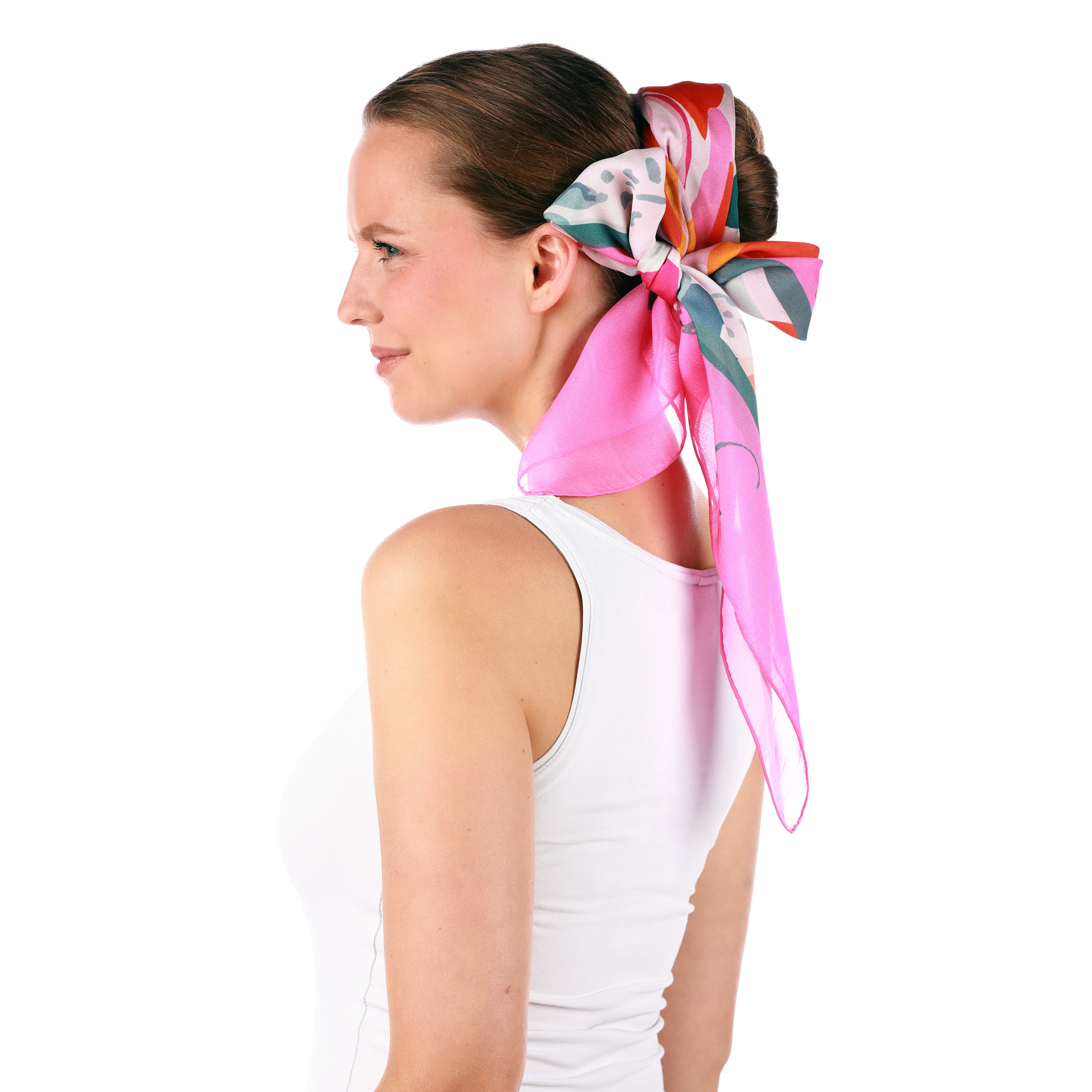 The ‘Flowers Rose’ design is a charming symphony of floral elegance. Encased within a serene pink border, accented by a slender green frame, the centerpiece is adorned with blooming roses in hues of pink and orange. This mesmerizing floral illustration imbues a sense of calm and beauty. The model wears a 140x140cm (approx. 55×55 in) Silk Chiffon scarf. For a different color palette, explore our ‘Flowers Green’ scarf.