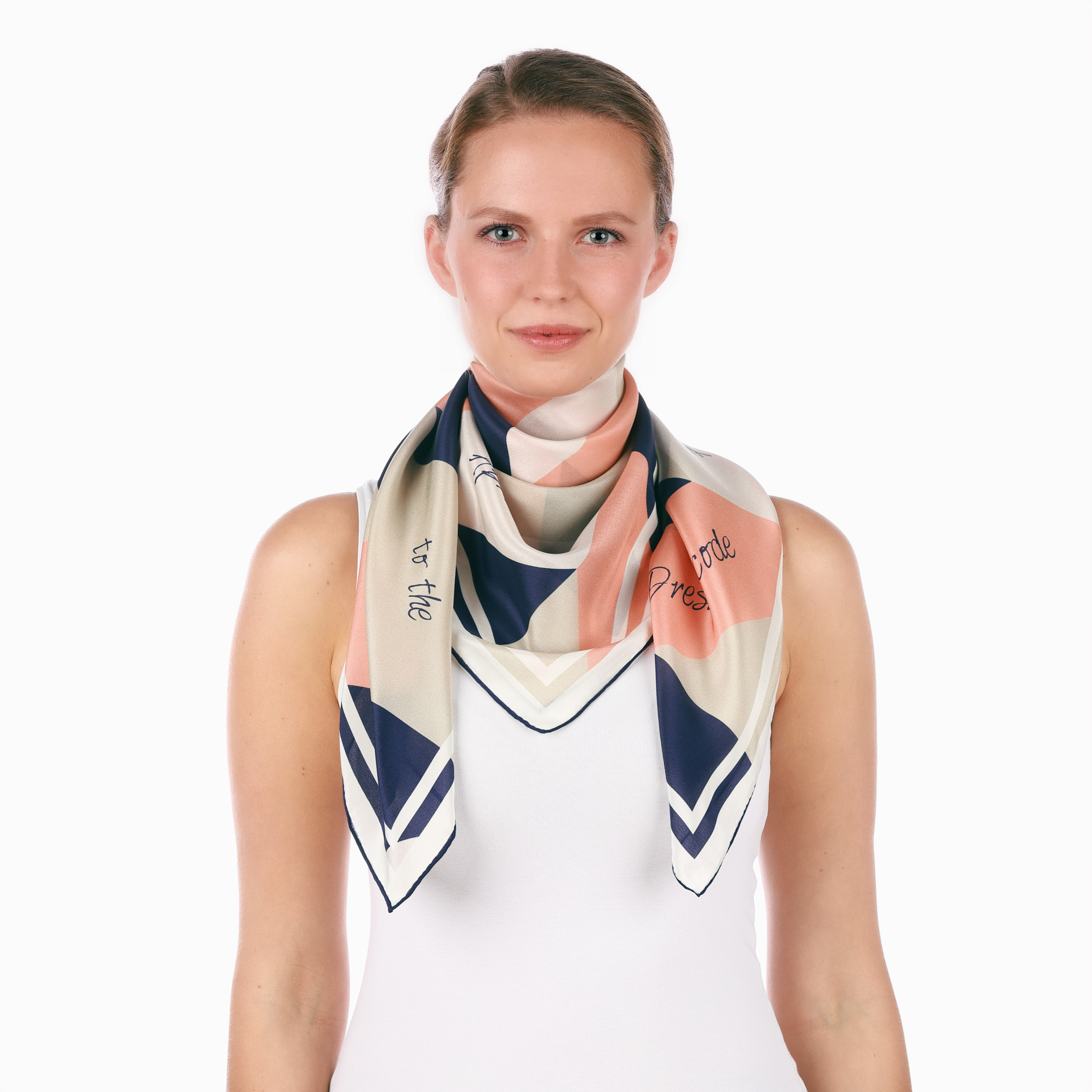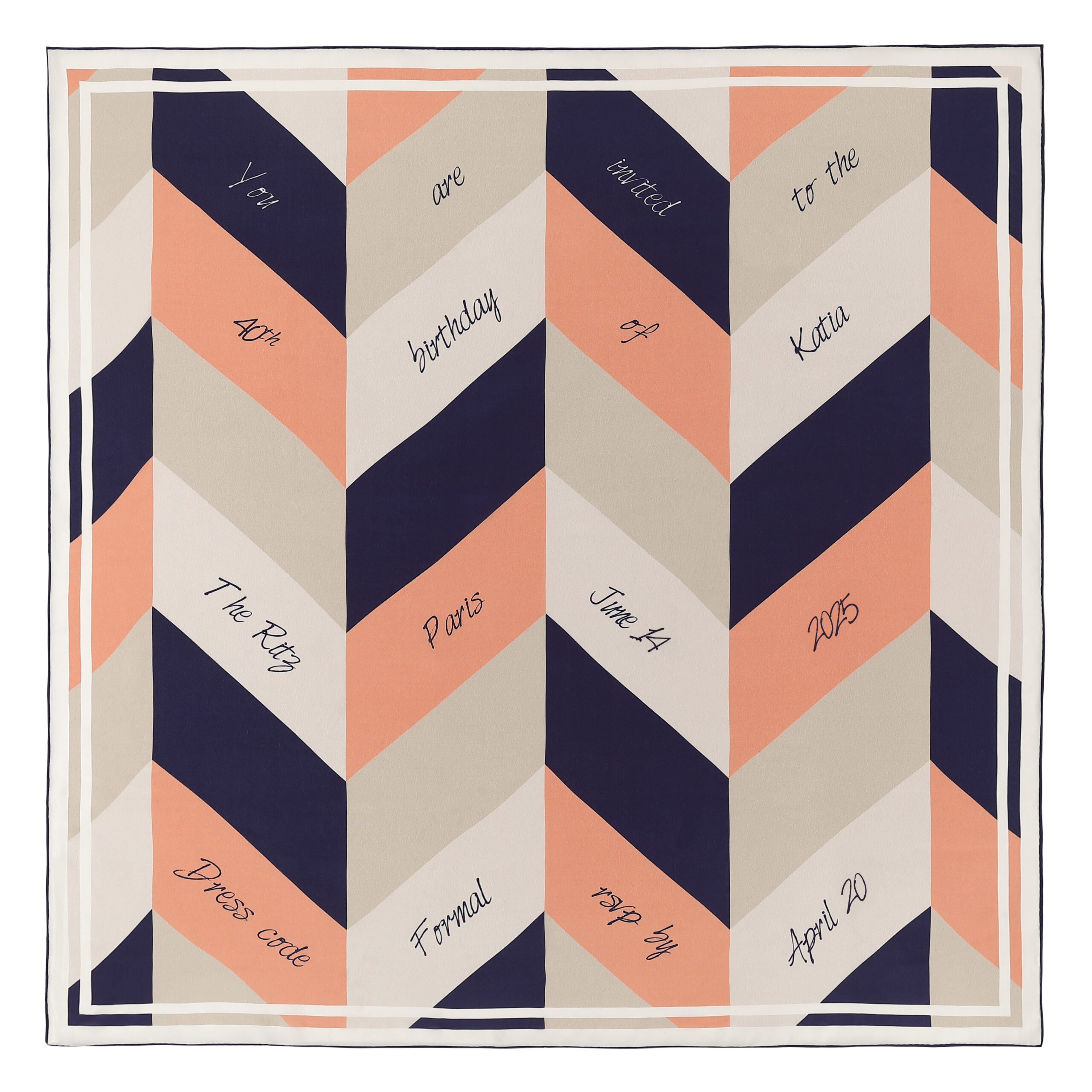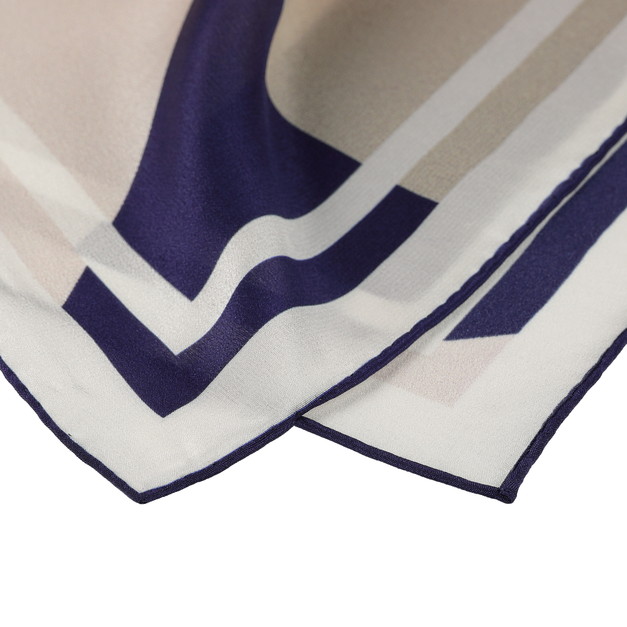 The ‘Geometric’ design is a modernist marvel, surrounded by a refined 1.5cm blue border that merges beautifully with the hand-rolled edges. Inside, sharp zigzag lines carve through the canvas, creating an array of text-housing boxes in a playful palette of silver, soft pink, salmon, and blue. Thoughtfully placed blue and white text adds a dynamic zigzag effect, highlighting the design’s unique personality. The model showcases a 90x90cm (approx. 35.4×35.4 in) Crepe de Chine scarf.