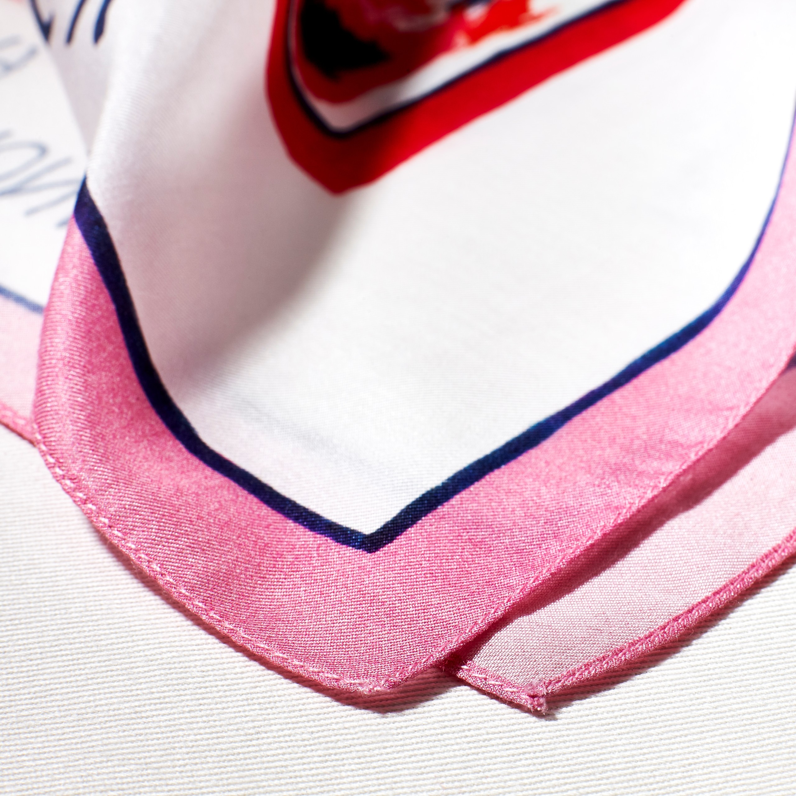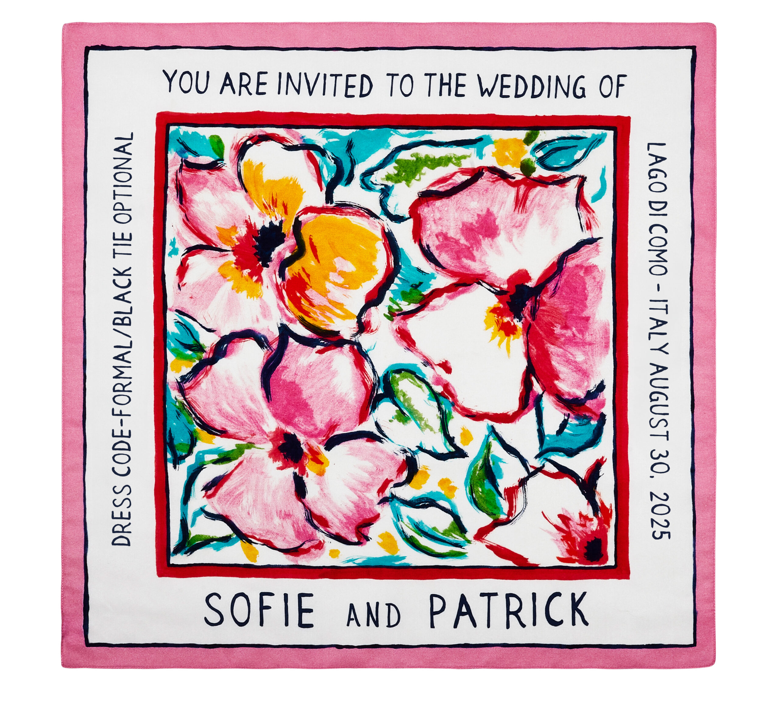 Erich Biehle’s vibrant, hand-painted design brings Lake Como to life. A delicate pink border encases a white inner frame, awaiting your personalized message. At the heart of the design, vibrant flowers and leaves burst forth, reflecting Erich Biehle’s expressive and meticulous style. The scarf showcased by the model is a 55x55cm (approx. 21.6×21.6 in) Silk Cotton piece.
